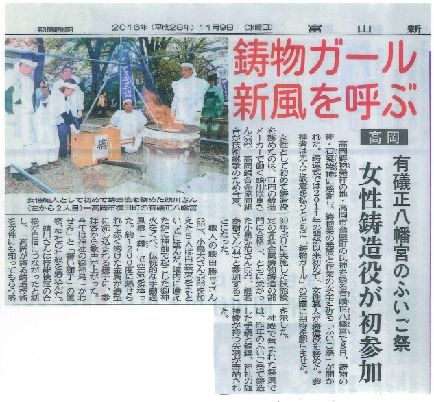 ふいご祭りに参加 技能検定非鉄金属鋳物鋳造作業の2級鋳造技能士の資格を取得しました。 富山県では初めての女性が取得しました。 当社の2級鋳造技能士の資格を取得した鋳物ガールが当社の錫製品を製造し、 ひとつひとつ手作りで、素敵な商品を製作しています。 新聞にも搭載されました。